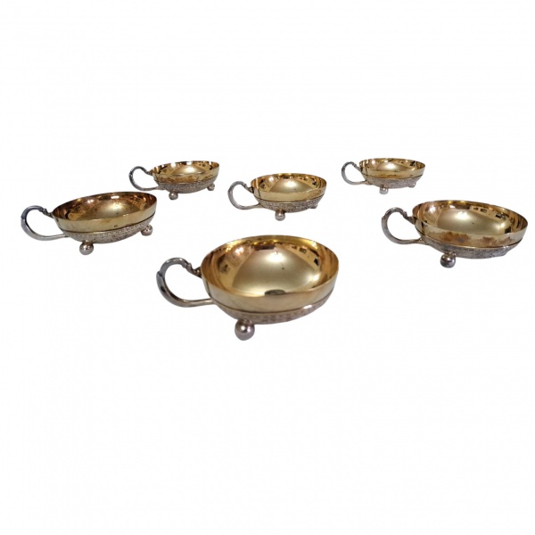• Seis taças para sorvete com bordas repuxadas, interior vermeil e apoiadas em pernas de bola, uma amassada na  borda, 9 x 4 cm.