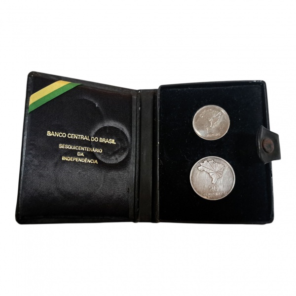 • COLECIONISMO,  Medalhas comemorativas do sesquicentenário da independência, 20 cruzeiros em prata e 1 cruzeiro em níquel.