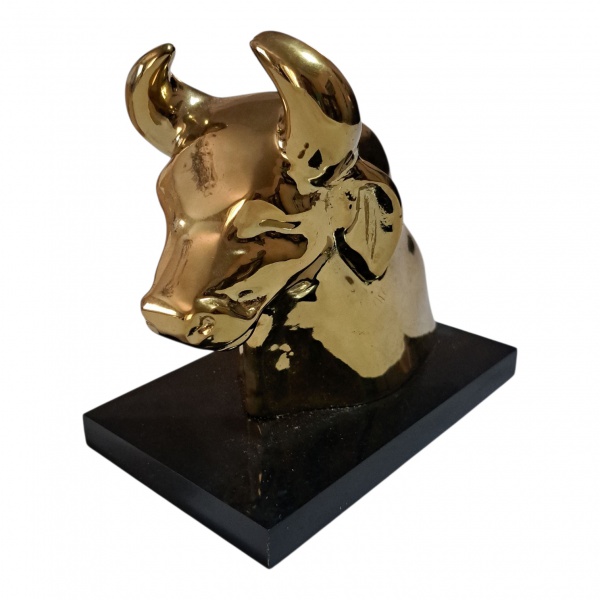 • Escultório em cobre patinado de dourado apoiado em base de resina negra, Alt. 16, base 16 x 10 cm.