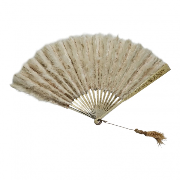 • COLECIONISMO - Antigo leque ornamentado com pelos naturais branco, Com. 32, Larg. 58 cm.
