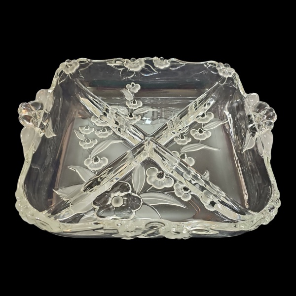 • Petisqueira com quatro divisórias em cristal lapidação em alto relevo representando flores, 26 x 26, Alt. 7 cm.