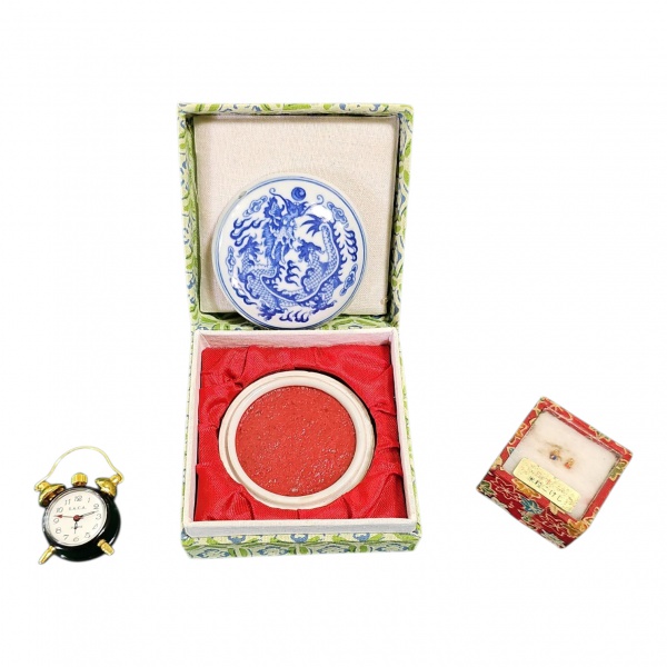 • COLECIONISMO - Relógio em miniatura Saca, não foi testado, escultura em arroz e  tinta para selo vermelho em caixa de porcelana, Diam. 2 e 6 cm.