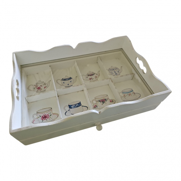 • Bandeja porta chá com gaveta 1 gaveta com 8 divisórias, fundo pintado à mão Village Gardner, 32 x21, Alt. 8 cm.