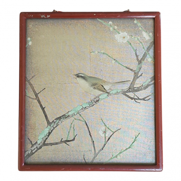 • Pintura sobre tecido representando pássaro em pessegueiro e selo vermelho, 29 x 26 cm.