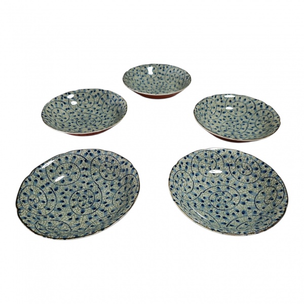 • Cinco bowls japoneses em porcelana com pinturas simétricas em sua embalagem original, Diam. 16, Alt. 5 cm.