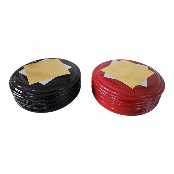 • Par de caixas em laca japonesa ditas sakuras, tampas com desenhos simétricos dourado e prateado  em sua embalagem original, Diam. 18, Alt. 7 cm.