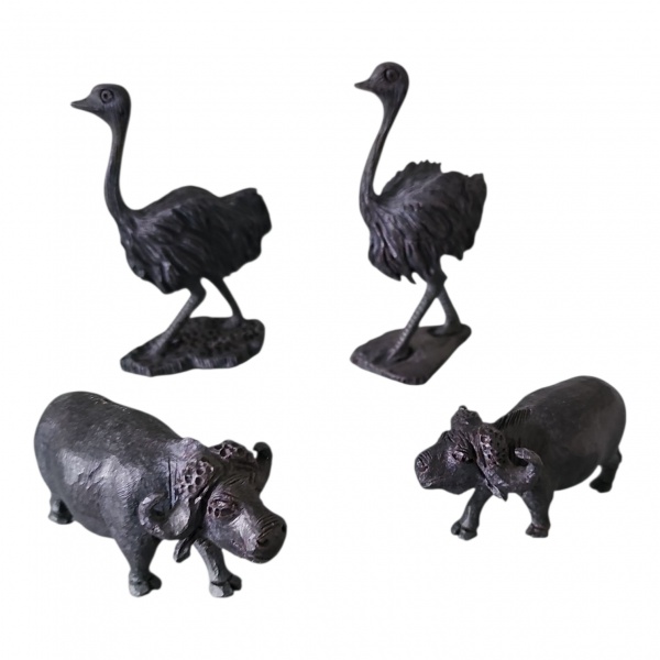 • Quatro escultóricos em madeira negra representando animais: 2 emas e par de búfalos, 7x 5 a 7 x 12 cm.
