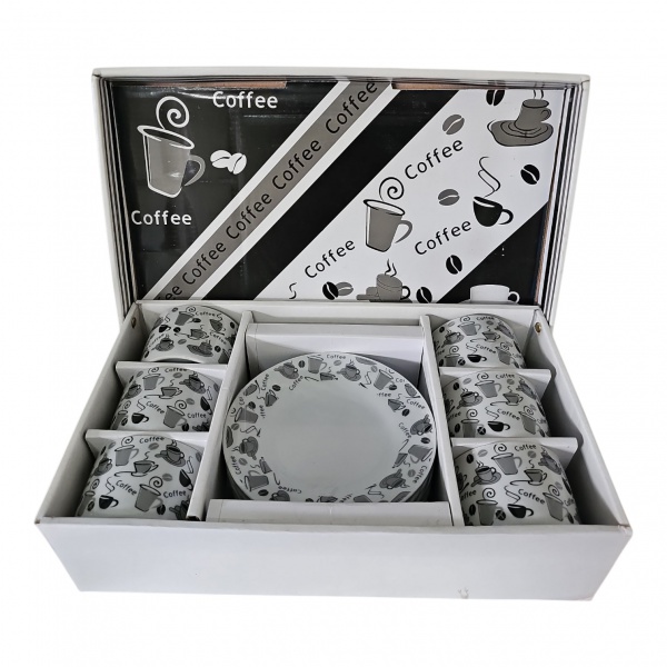 • Seis xícaras com pires para café em porcelana com decoração preto e cinza sobre fundo branco, Bon Gourmet, lacrado, Alt. 6, Diam. 8 cm.