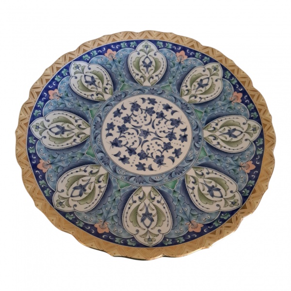 • Medalhão em porcelana japonesa policromada com bordas recortadas e douradas, marcado na base, Diam. 32 cm.