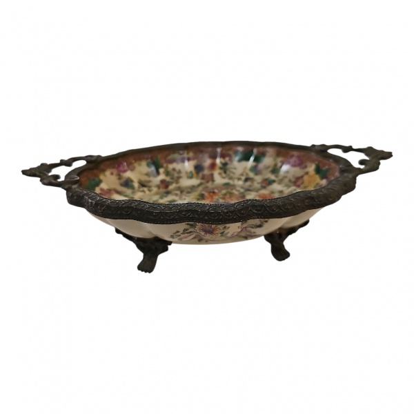 • Travessa chinesa em porcelana policromada, guarnição em cobre, marcada na base, n20 x 11, Alt. 11 cm.