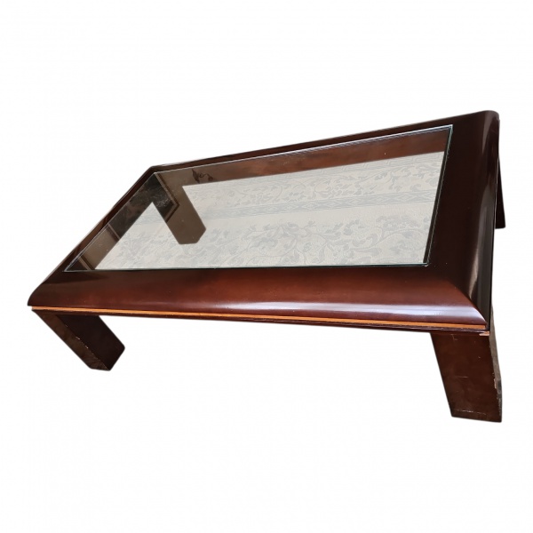 • Mesa de centro em madeira nobre na cor tabaco, friso em madeira mais clara, com tampo de vidro, 118 x 70, Alt. 35 cm.
