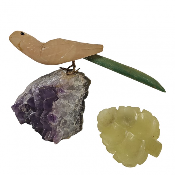 • Pássaro em pedra apoiado em drusa ametista (falta o bico) e uma folha esculpida em jade, Com. 20 e 11 x 9 cm.