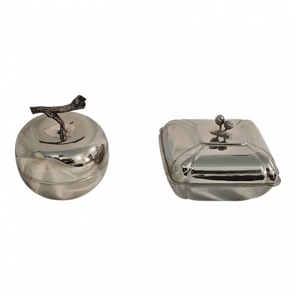 • Dois baleiros em inox um deles em forma de maça com pega representando galho,  14 x 11, Alt. 9 e Alt. 10, Diam. 12 e
