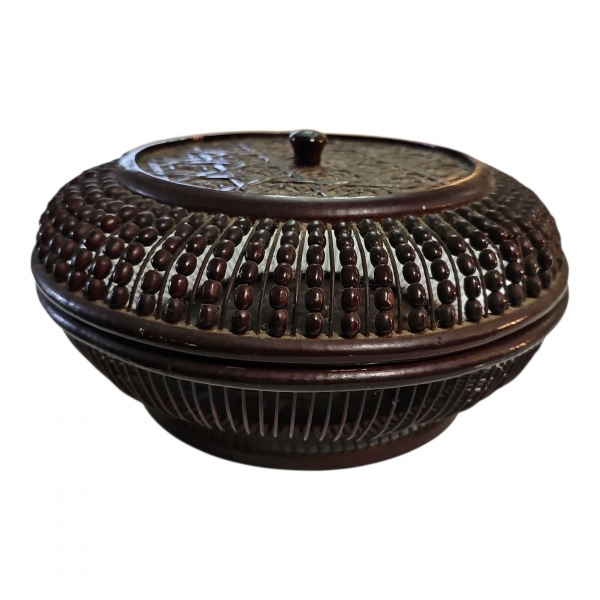 • Caixa oriental executada em madeira, tampo entalhado, laterais com sementes e parte inferior vasada em filetes, falta 1 semente, Alt. 15, Diam. 27 cm.