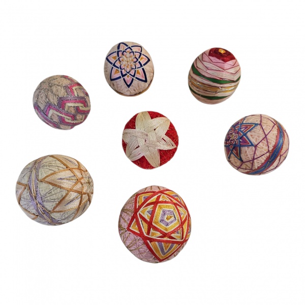 • Temari, oito esferas técnica japonesa em linha e lã, Diam. 9
