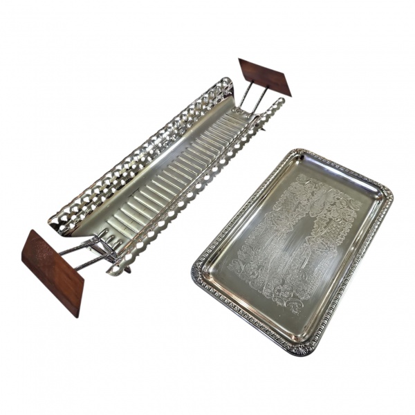 • Duas travessas espessuradas à prata, sendo uma delas para rocambole com asas de madeira, 26 x 16 e  44 x 12 cm.