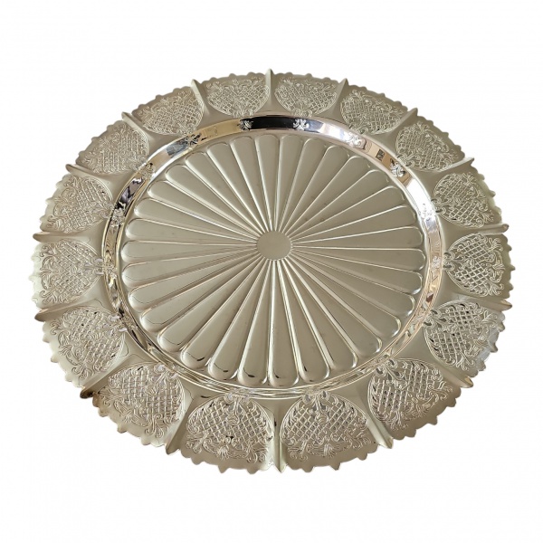 • Bandeja espessurada à prata 90, Art Prata, com bordas lavradas e vasadas, centro canelado, Diam. 34 cm.