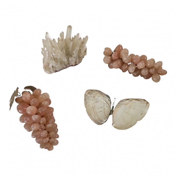 • Par de cachos de uvas em quartzo rosa, drusa de cristal e par de conchas alusivas a design de borboleta, Com. 20 e 15 e  18 x 8, Alt. 11 cm.