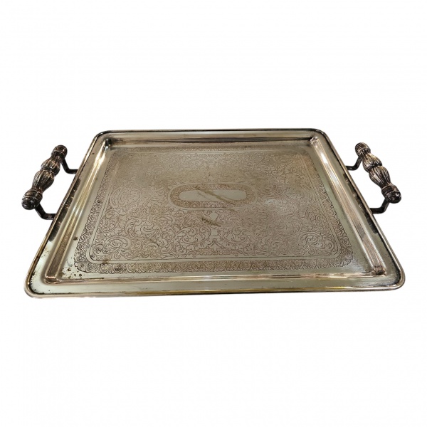 • Bandeja espessurada à prata, fundo lavrado e cinzelado e asas torneadas, apresenta marcas do tempo, 41 x 31 cm.