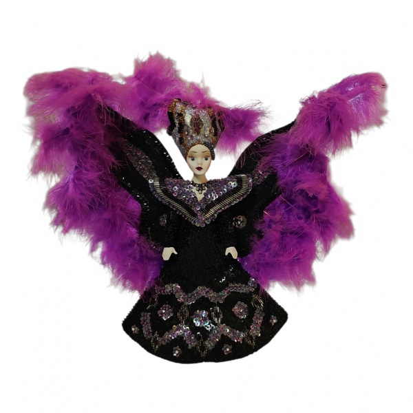 • Boneca com extremidades de cerâmica com roupa bordada em pedras, lantejoulas e plumas (customizada para carnaval), Alt. 22 cm.