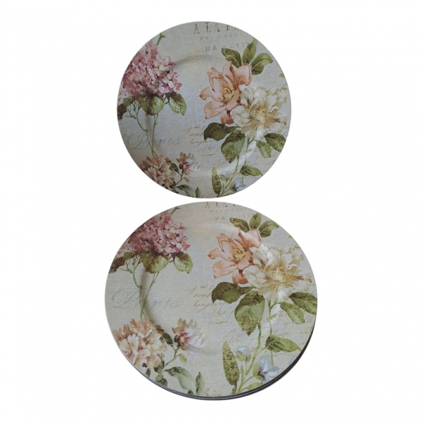 • Oito sousplats  franceses com fundo floral plastificado, Diam. 33 cm.