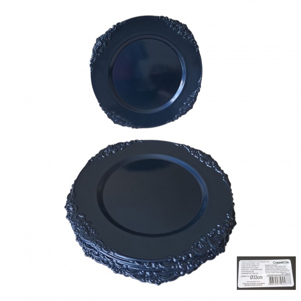 • Dez sousplats na cor azul petróleo em polipropileno com adição de carbono cálcio, bordas em alto relevo, Diam. 33 cm.