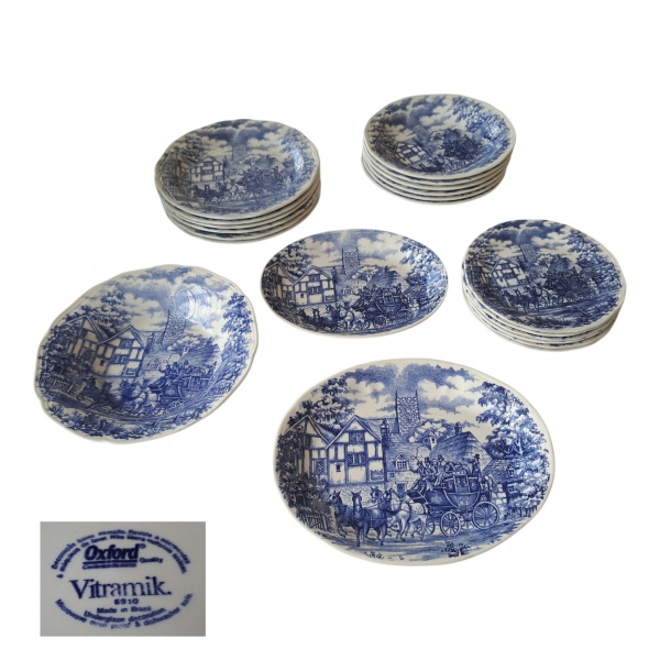 • Guarnição em porcelana Oxford para jantar decoração rural azul sobre fundo branco composto de: 6 pratos principais, 6 para sopa, 6 para sobremesa, 2 travessas ovais e 1 circular Diam. 24 e  28 x 22 e 23 x 19 cm.  Total 21 peças.