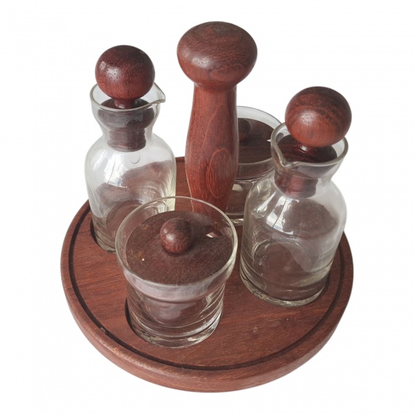 • Galheteiro em madeira e vidro by Ca Doro, composto de: azeiteiro, vinagreiro, pimenteira e saleiro, base circular com suporte central, Diam. 15, Alt, 16 cm.
