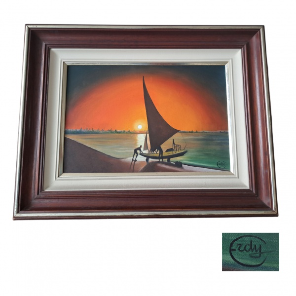 • RDY - Óleo sobre Tela, acid, representando jangada ao por do sol, verso com etiqueta de participação na Exposição Fim de semana em Campo São Bento, 45 x 32 e 66 x 53 cm.