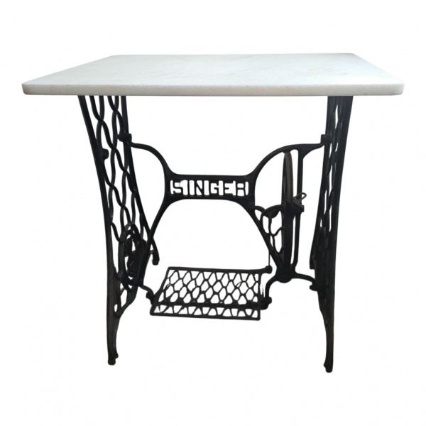 • Mesa de apoio executada em pé de máquina de costura Singer em ferro, tampo em mármore branco, 70 x 50, Alt. 73 cm.