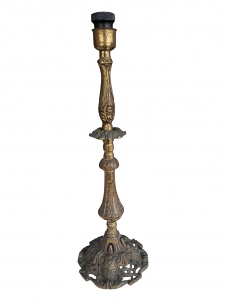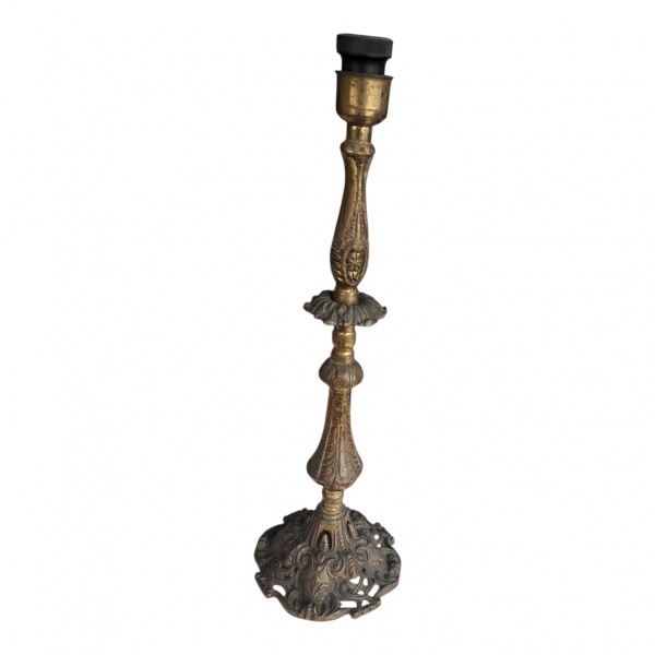 • Tocheiro para uma luz  em bronze lavrado e cinzelado, apresenta fiação elétrica cortada, Alt. 47, Diam. 18 cm.