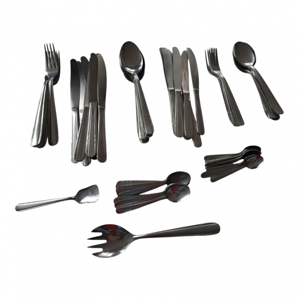• Faqueiro Hércules Inox  388 composto de:  9 garfos principais, 8 facas principais serrilhadas,  13 colheres para sopa, 8 facas para sobremesa serrilhadas, 6 garfos para sobremesa, 8 colheres para sobremesa, 1 colheres para servir, 11 colheres para chá, 11 colheres para café, 1 colher para açúcar, Total: 79 peças. e porta talheres em madeira pintado à mão, 20 x 14, Alt. 16 cm.