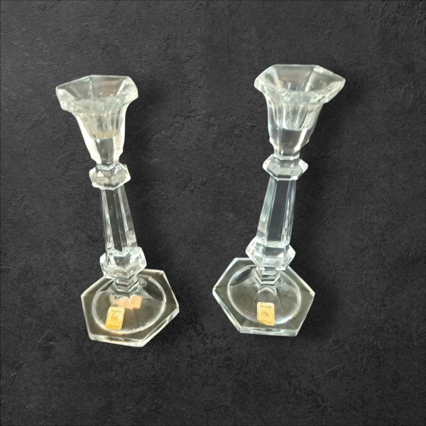 • Par de castiçais para uma vela em cristal translúcido by La Vida,  base e bordas da bobeche sextavadas, Alt. 20, Diam. 5 e 8 cm.