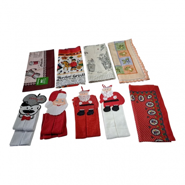 • Nove peças  com motivos Natalinos sendo 5 panos para bandeja, 2 toalhas de copa e 1 pano de prato e um caminho de mesa 97 x 30 (o caminho com leves marcas de guarda).