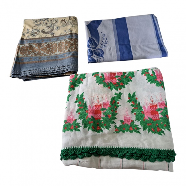 • Três toalhas de mesa, uma delas com bainha em bilro e motivos natalinos,  todas com leves marcas de guarda, Natalina: 228 x 146 cm.  estampa azul: 140 x 140 e estampado em fundo amarelo 220 x 140 cm.
