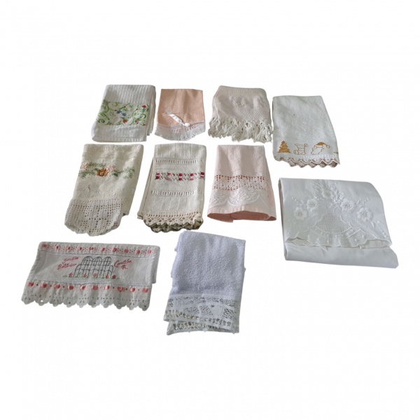 • Dez toalhas de mão para lavabo, uma delas em linho, e duas com marcas de guarda.
