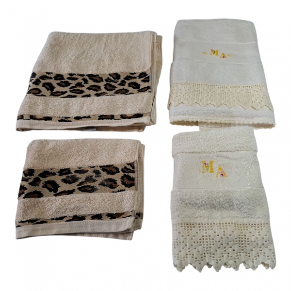 • Dois jogos de toalhas banho e rosto, a creme com Monograma MA e bainha de crochê.