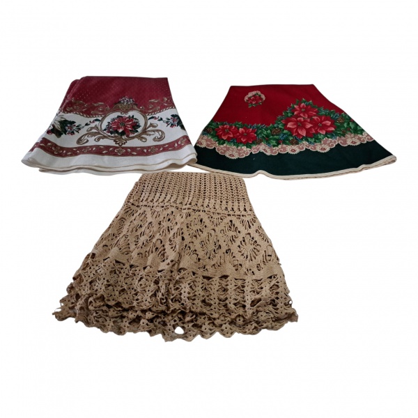 • Três toalhas de mesa redondas, crochê Diam. 130 cm. vermelha floral e verde, Diam. 148 cm. vinho branca e floral, Diam. 204 cm.