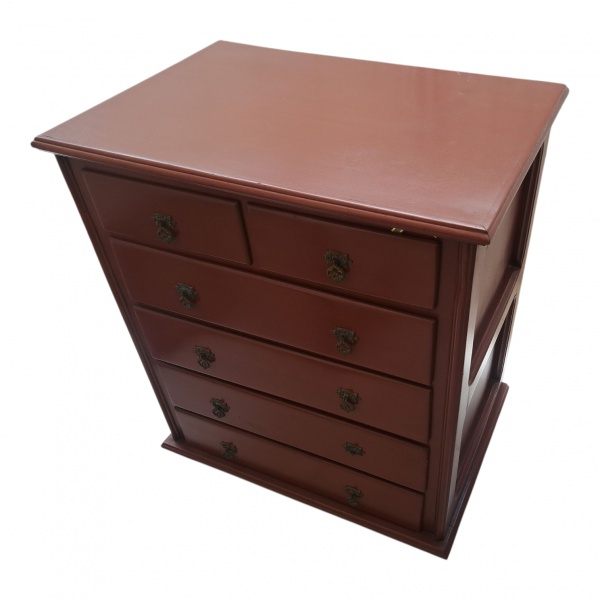 • Cômoda em madeira, tampo apoiado em base retangular com 2 gavetas na parte superior e 4 gavetas centrais, puxadores em bronze 63 x 84, Alt. 75 cm.