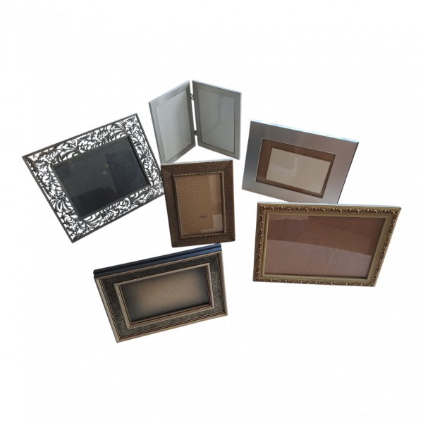 • Seis porta-retratos diversos, um deles duplo, e um em metal vasado by Le Lis Blanc,  26 x 21 a 20 x 17 cm.