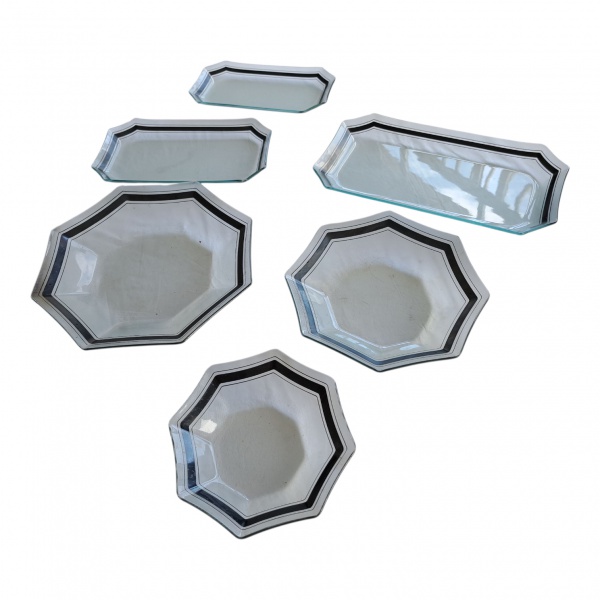 • Seis travessas em vidro translúcido, bordas oitavadas e galerias em negro, podem ir ao micro-ondas.