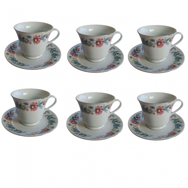 • Seis xícaras com pires para chá em porcelana policromada em flores,  Diam. 9, Alt. 8 cm.