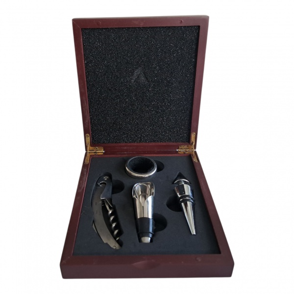 • Kit sommelier composto de 4 peças em sua embalagem original de madeira, 17 x 15 cm.