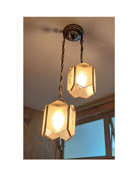 • Luminária de teto com 2 cúpulas pendentes de lâminas lapidadas Alt. 62 cm.