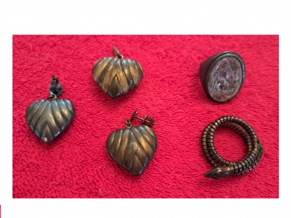 • PRATA - Três pedantifes representando coração, 2 anéis, um deles representando serpente, aros: 18 e 22 , 33gr
