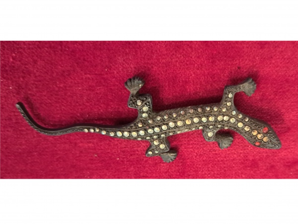 • Broche em prata representando lagartixa cravejada de pedrinhas brilhantes e olhos vermelhos,  12,8 gr. E 18 x 3 cm.
