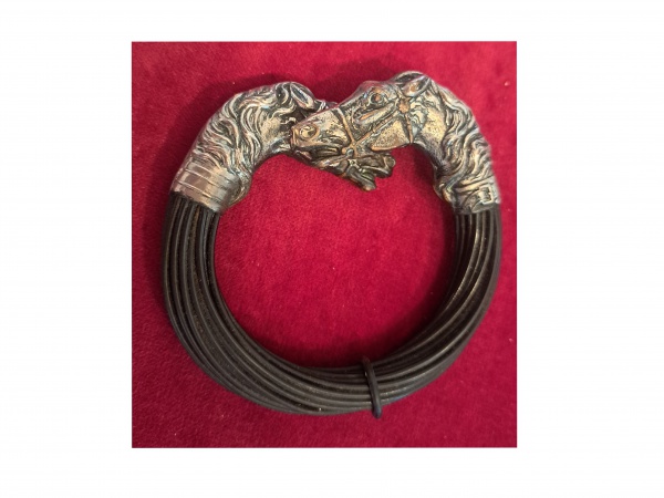 • Pulseira feminina executada com fios de rabo de elefante e fecho com cara de cavalo em metal prateado.
