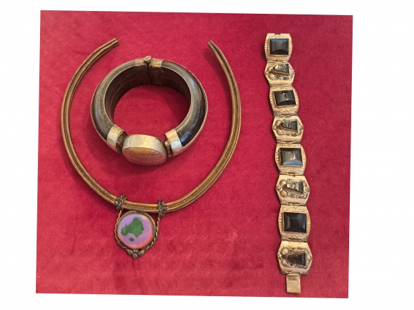 • Cinco pulseiras e um broche com medalhão de época com desgaste, em modelos diversos.