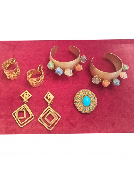• Cinco bijuterias em metal dourado: dois braceletes adornados com peras brasileiras, 1 broche cravejado de pedras azuis e 2 pares de brincos.